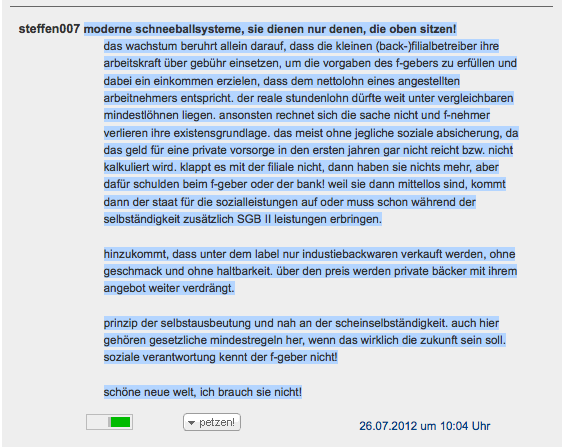 Der Umstand, dass in Backshops typischerweise Industriebackwaren verkauft werden und dass Massenprodukte niemals die Qualität von handgefertigten, individuellen Produkten erreichen können, kann nun wirklich nicht der Franchise-Wirtschaft angelastet werden. Es handelt sich um die überall zu beobachtenden Auswirkungen der Industriegesellschaft und des dazu gehörigen Verbraucherverhaltens. Wir alle haben es in unserer Eigenschaft als Verbraucher in der Hand, diesen Trend zu stoppen. Ich persönlich kaufe mein Brot nur im Bioladen. Aber mir ist auch klar, dass sich das nicht jeder leisten kann.